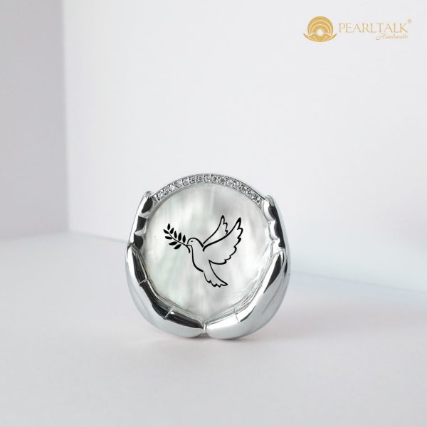 Mô tả sản phẩm: Cài áo xà cừ khắc hình chim bồ câu – biểu tượng hòa bình và Chúa Thánh Thần. Viền bàn tay bạc sáng bao quanh, tôn lên vẻ đẹp thanh thoát của mặt sà cừ. Phù hợp làm phụ kiện dự lễ, gặp gỡ cộng đồng tôn giáo hoặc làm quà tặng ý nghĩa cho người thân.